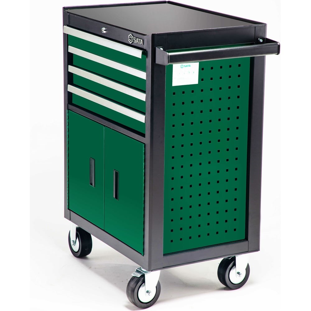 Инструментальная тележка Sata 692x488x840 мм, 4 выдвижных лотка, 1 ящик, отдельно доп. перфорир. панель для инструментов 95125 предназначена для рациональной организации рабочего места. В изделии используется высококачественный холоднокатаный стальной лист, обладающий высокой прочностью и долговечностью. Усиленные шариковые направляющие толщиной 45 мм могут легко и плавно открываться и закрываться даже при номинальной максимальной нагрузке. 5-дюймовые усиленные ролики обеспечивает плавное бесшумное открытие. Прочная глянцевая ручка из алюминиевого сплава отличается удобством использования. Специальное напыление поверхности исключает возникновение коррозии. Поролоновая обивка во всех ящиках создает удобство хранения. Общая статическая грузоподъемность. Внимание! Перфорированная панель для инструмента в комплект поставки не входит и приобретается отдельно!
