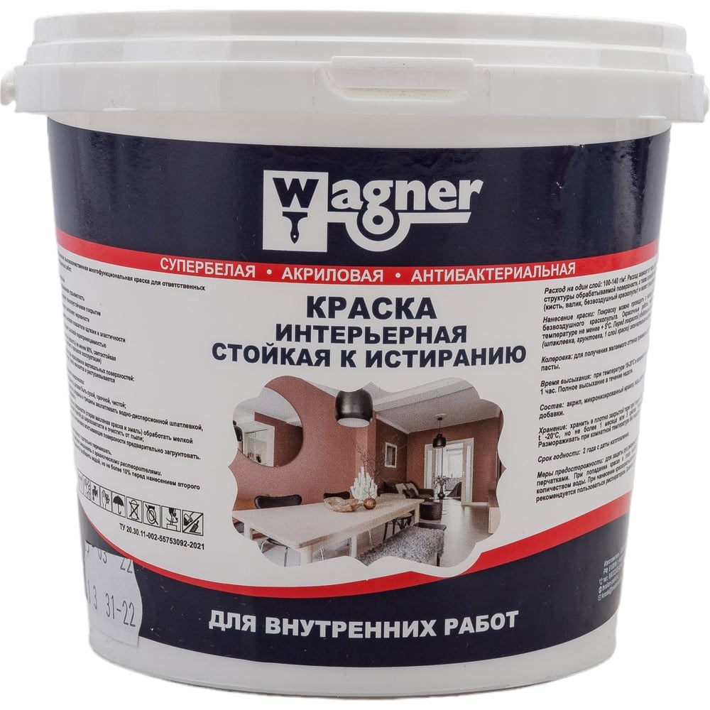 Интерьерная акриловая краска Wagner стойкая к истиранию, 1.3 кг арт.2776 - это высококачественная многофункциональная акриловая краска для ответственных интерьерных работ. Благодаря составу, краска удобна при окрашивании вертикальных поверхностей: не течет, легко наносится и растушевывается. Повышенная укрывистость позволяет экономить материал. Продукт равномерно распределяется по поверхности при помощи кисти, валика или краскораспылителя и образует матовое супербелое покрытие. Дополнительные технические характеристики: Класс пожароопасности: КМ0. Белизна (яркость) не менее 90%. Внимание! Фото может отличаться от товара, при выборе ориентируйтесь на технические характеристики.