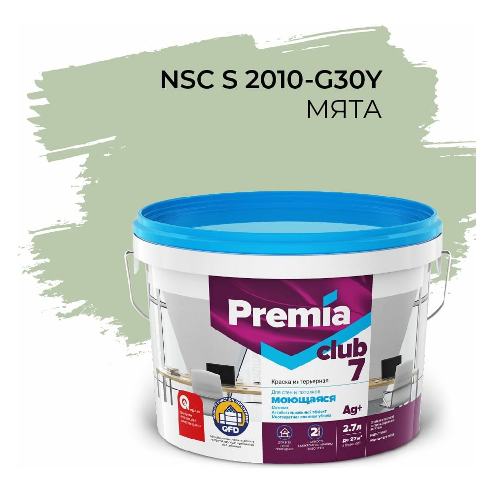 Интерьерная колерованная краска PREMIA CLUB 7 для стен и потолков, моющаяся, мята S 2010-G30Y, ведро 2.7 л О05693 идеально подойдет для создания дизайна и уюта помещений с высокой эксплуатационной нагрузкой. После высыхания образует гладкое матовое покрытие, которое скроет мелкие дефекты, надёжно защитит поверхность от влаги и плесени и придаст помещению современный эстетичный вид. PREMIA CLUB 7- лучший выбор для окраски ванных комнат, кухонь, коридоров, парадных и других помещений, где необходима регулярная влажная уборка. Покрытие выдерживает более 50 000 проходов щеткой. Рекомендуется для окраски детских, спортивных и лечебных учреждений. Подходит для окраски путей эвакуации (класс пожароопасности - КМ 1)/.
