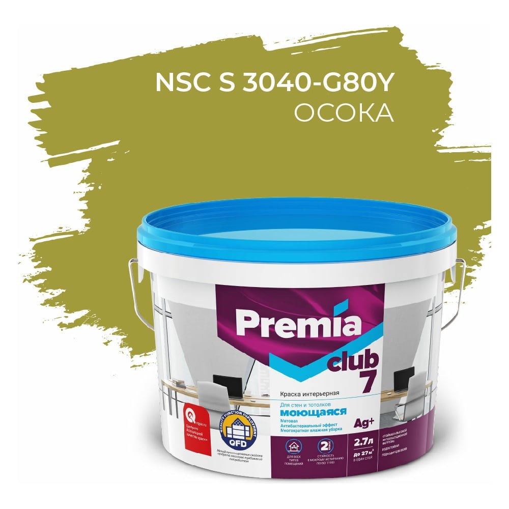 Интерьерная колерованная краска PREMIA CLUB 7 для стен и потолков, моющаяся, осока S 3040-G80Y, ведро 2.7 л О05705 идеально подойдет для создания дизайна и уюта помещений с высокой эксплуатационной нагрузкой. После высыхания образует гладкое матовое покрытие, которое скроет мелкие дефекты, надёжно защитит поверхность от влаги и плесени и придаст помещению современный эстетичный вид.PREMIA CLUB 7- лучший выбор для окраски ванных комнат, кухонь, коридоров, парадных и других помещений, где необходима регулярная влажная уборка. Покрытие выдерживает более 50 000 проходов щеткой.Рекомендуется для окраски детских, спортивных и лечебных учреждений. Подходит для окраски путей эвакуации (класс пожароопасности - КМ 1).