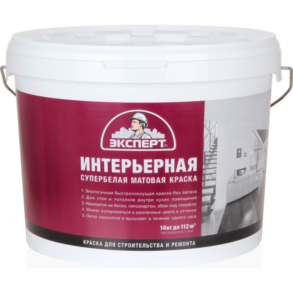 Краска интерьерная супербелая ЭКСПЕРТ 14 кг 16011 применяется для окраски стен и потолков внутри сухих помещений. Идеальна для бетонных, зашпатлеванных и оклеенных обоями стен. Обладает высокой степенью белизны и укрывистости. Хорошая стойкость к истиранию. Очень экономичная в применении. Наносится на бетонные и оштукатуренные поверхности, гипсовые и гипсокартонные плиты, структурные и стеклообои.
