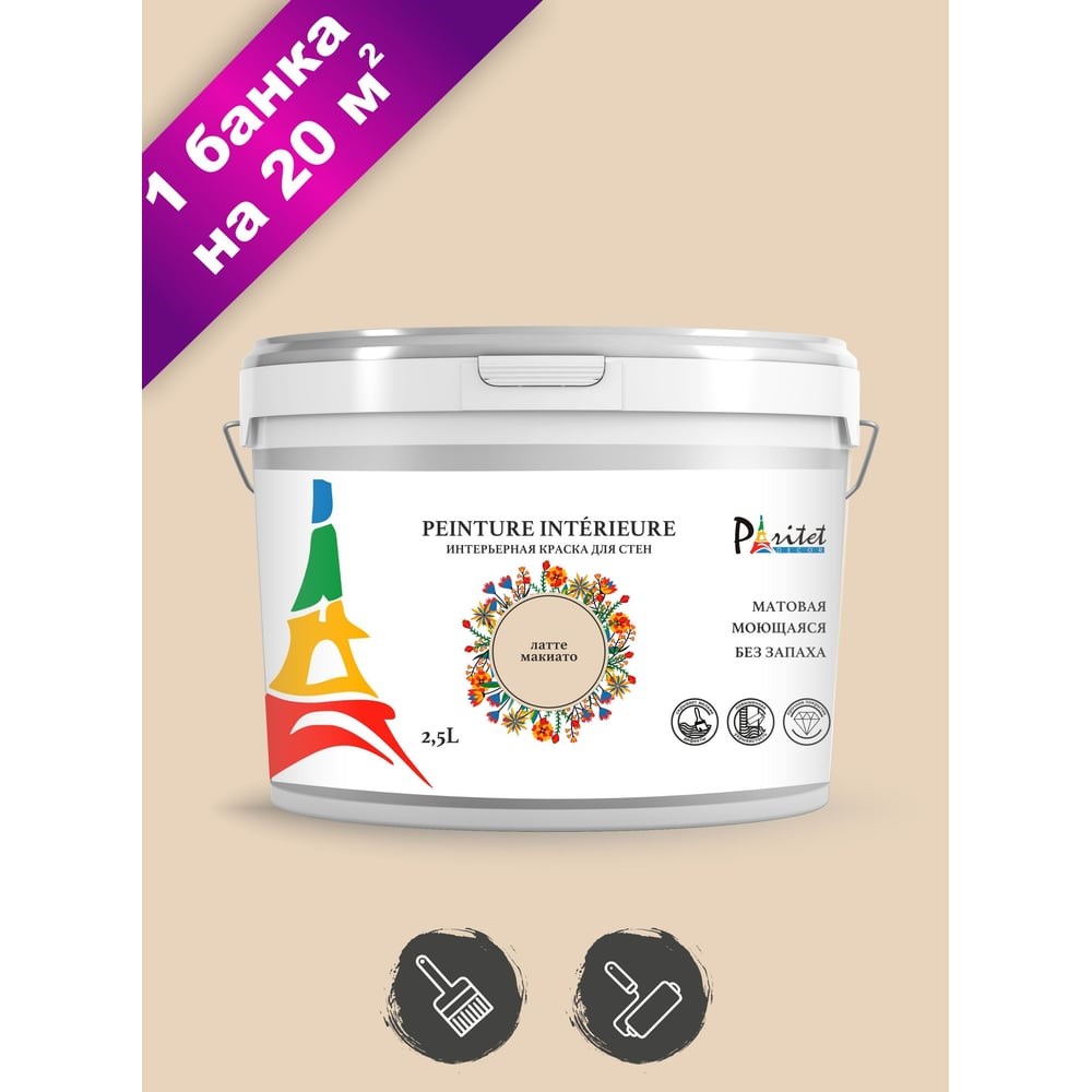 Интерьерная краска Paritet 2.5 л, латте макиато PDRMC-15 на основе высококачественных полимеров предназначена для декоративно-защитной окраски стен и потолков в жилых и офисных помещениях, а также в объектах общественного пользования. Благодаря составу, продукт обладает отличной адгезией к поверхностям: бетон, бетонные блоки, цемент, цементная штукатурка, гипс, гипсовые и гипсокартонные плиты, ДСП, обои под покраску. Идеально подходит для помещений с умеренной эксплуатационной нагрузкой и нормальной влажностью. Краска равномерно распределяется по основанию при помощи кисти, валика или краскопульта и создает прочное матовое покрытие стойкое к легкой влажной уборке.