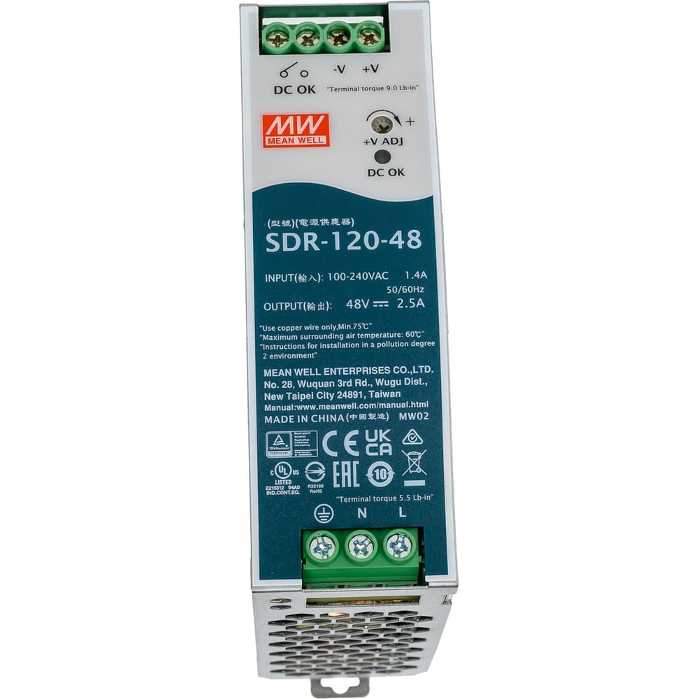 AC-DC сетевой преобразователь серии SDR-120 для монтажа на DIN рейку. ККМ; 120 Вт; 48 В.ОсобенностиВыдерживает перегрузки до 150%;Встроенный активный ККМ;Защита от короткого замыкания, перегрузки, перенапряжения на выходе и перегрева;Естественное охлаждение;Узкий корпус;Установка на DIN рейку;Релейные контакты DC OK