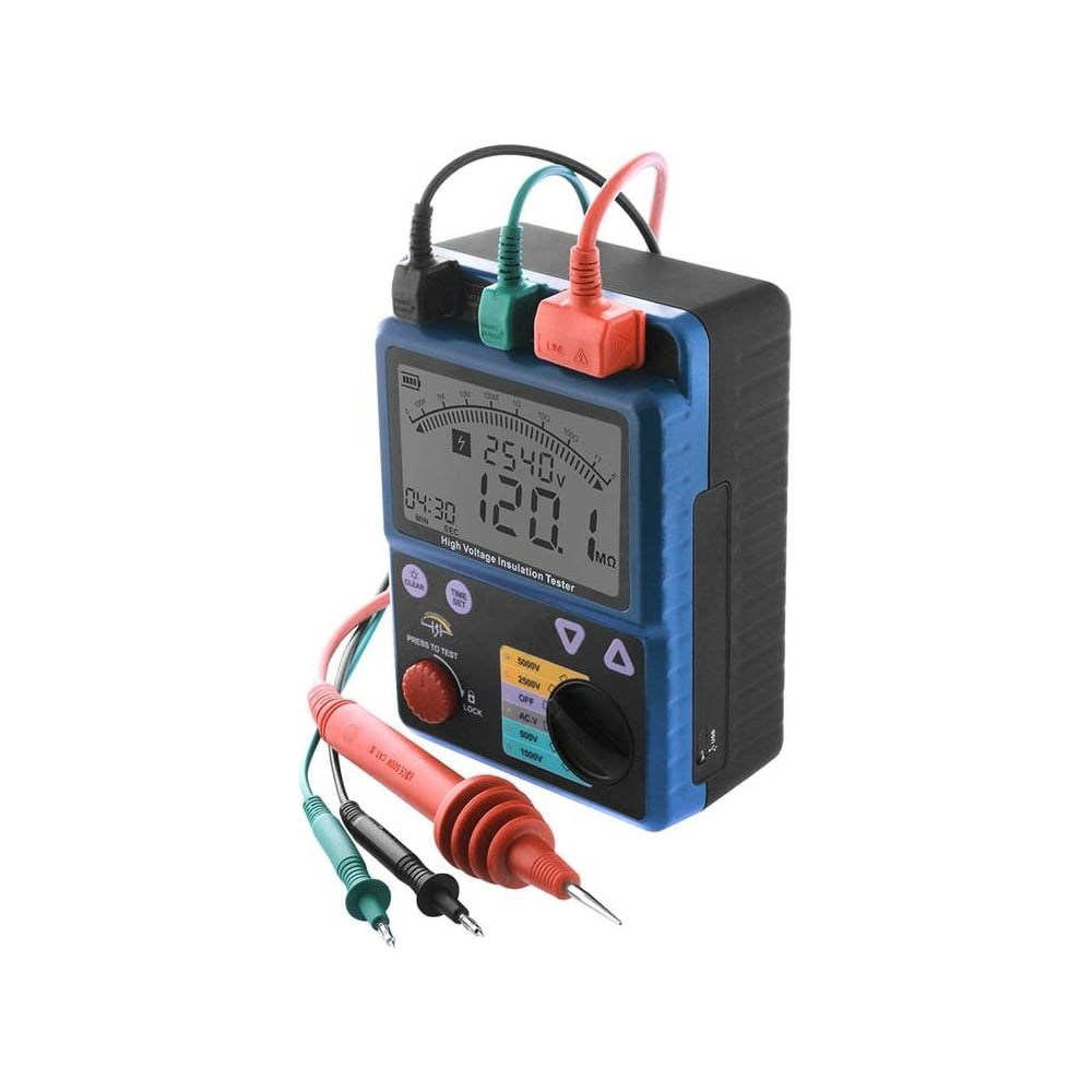 Измеритель сопротивления изоляции МЕГЕОН 13900 представляет собой портативный контрольно-измерительный приборы для проверки сопротивления изоляции с использованием высоких значений испытательных напряжений оснащен USB интерфейсом. Корпус прибора имеет стильный двухцветный внешний вид и яркие наклейки- указатели. Для проведения испытаний предусмотрено пять тестовых напряжений: 500В, 1000В, 2500В, 5000В. А также предусмотрено выключение испытательного напряжения по окончании измерения. Благодаря наличию яркой светодиодной подсветки дисплея предоставлена возможность работы в условия недостаточной видимости или в отсутсвуии освещения. Для сохранения уровня заряда элементов питания предусмотрена функция автоматического выключения питания. Измеритель сопротивления изоляции (мегаомметр) внесен в государственный реестр СИ, под номером 74507-19, срок периодической поверки составляет 2 года.