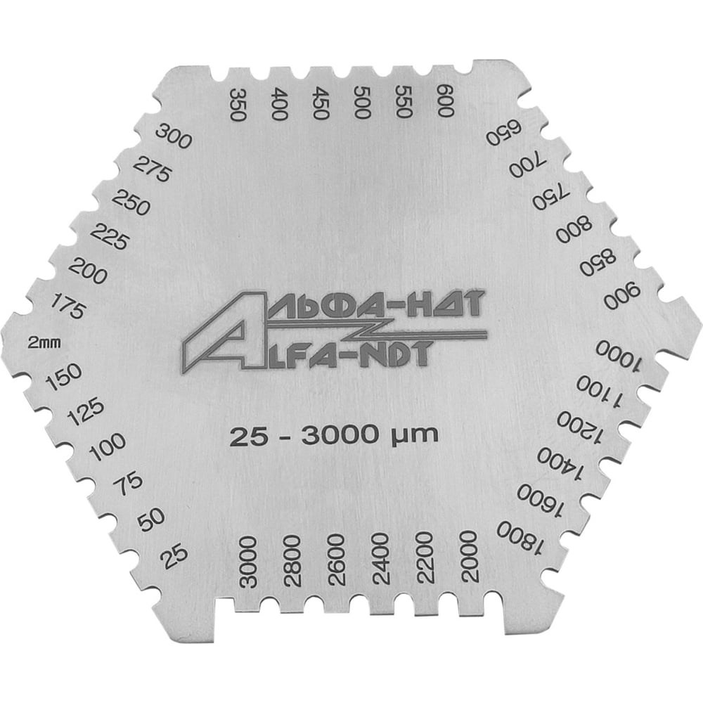 Гребенка предназначена измерять толщину незатвердевших покрытий на плоских и цилиндрических изделиях в соответствии с ISO 2808-2007 и ГОСТ Р 51694-2000. Данным инструментом измеряют толщину покрытий сразу после их нанесения на подложку. С помощью рядов насечек, похожих на зубья расчески, возможно измерить толщину влажной пленки покрытий, таких как: краски, смолы, лакокрасочные материалы, лаки и гели и т.д.Инструмент представляет собой гексагональную гребенку из нержавеющей стали и используется для измерения толщины мокрого слоя. Угловые зубцы гребенки, выполненной в форме многоугольника, расположены на нулевом уровне. Расстояние между не угловыми зубцами и нулевым уровнем постепенно увеличивается. Величина зазора измеряется в µm и градуирована на выступе.Толщиномер-гребенка мокрого слоя краски 25-3000 АЛЬФА-НДТ имеет 6 граней и 36 точек измерения (зубцов), что обеспечивает высокую дискретность измерений.Калибровка «Измерительной гребенки толщины мокрого слоя краски» производится средствами и методами, указанными в методике калибровки МК.ИМЦ.03.04.2020 рабочего средства измерений – Толщиномеры мокрого слоя краски АЛЬФА-НДТ.