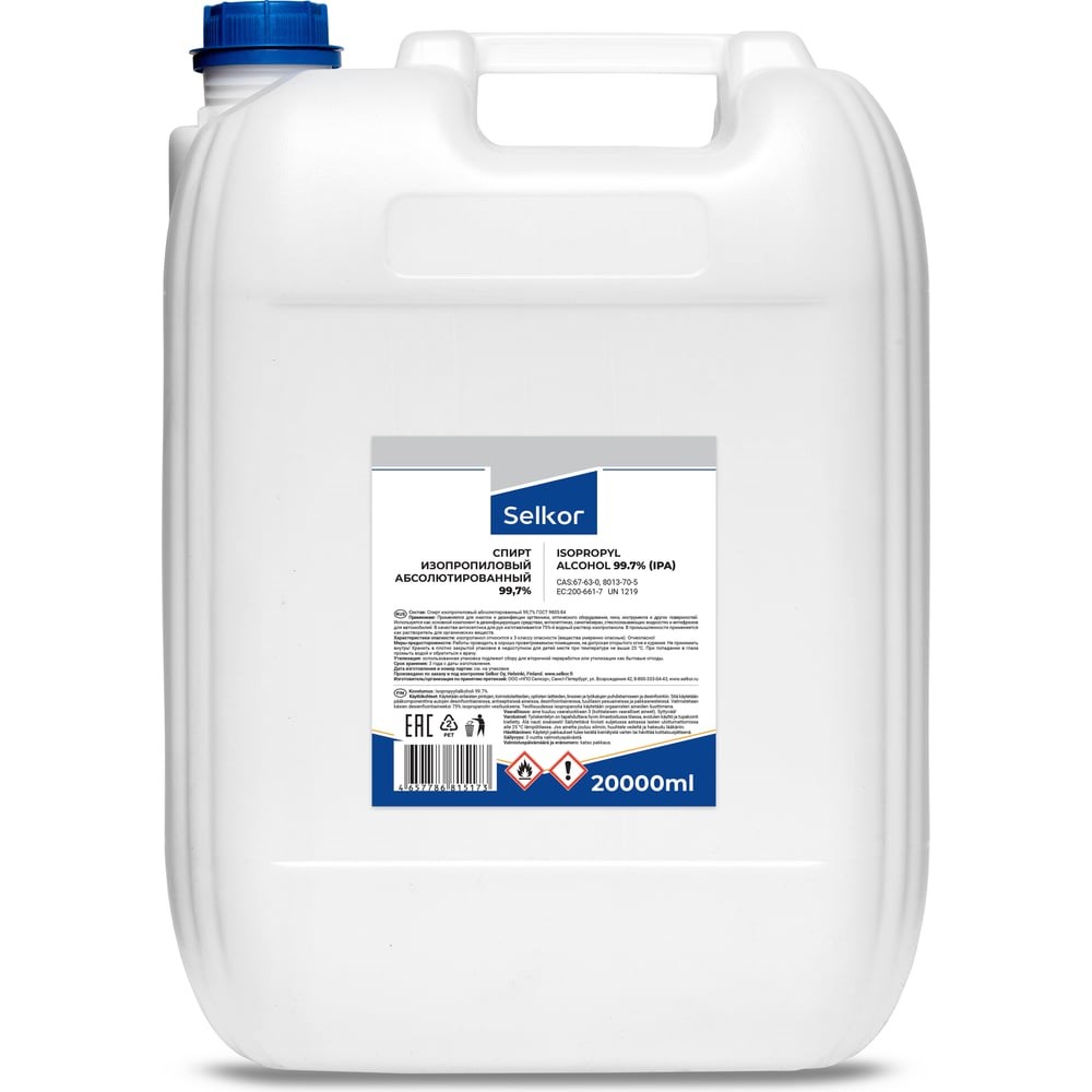 Спирт изопропиловый абсолютированный Selkor применяется для очистки и дезинфекции различных поверхностей, оргтехники, оптического оборудования, линз, инструмента. Используется как основной компонент в дезинфицирующих средствах, антисептиках, санитайзерах, стеклоомывающих жидкостях и антифризов для автомобилей. В качестве антисептика для рук изготавливается 75%-й водный раствор изопропанола. В промышленности применяется как растворитель для органических веществ. Меры предосторожности: Работы проводить в хорошо проветриваемом помещении, не допуская открытого огня и курения. Не принимать внутрь! Хранить в плотно закрытой упаковке в недоступном для детей месте при температуре не выше 25 С. При попадании в глаза промыть водой и обратиться к врачу.