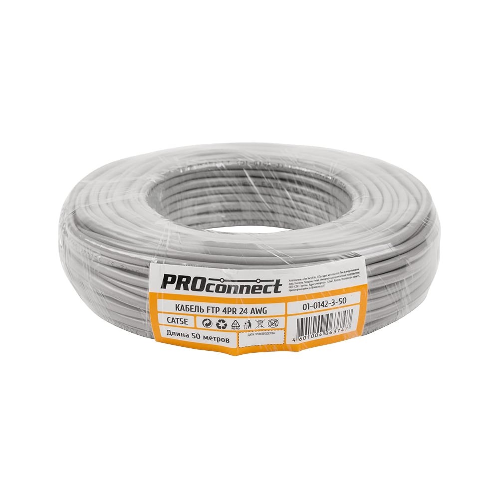 Кабель витая пара F/UTP серого цвета PROconnect предназначен для создания локальных сетей общего назначения, домашних сетей, сетей малого бизнеса, компьютерных сетей, сетей передачи данных, узкоспециализированных сетей. Применяется для подключения устройств охранной системы, телефонии, интернета, цифрового телевидения и т.д. Предназначен для прокладки внутри зданий. Относится к категории 5е: рассчитан на рабочие частоты от 1 до 100 МГц.Проводник кабеля изготовлен из алюминия, плакированного медью CCA, и покрыт изоляцией из полиэтилена повышенной плотности HDPE (диаметром 0,9 мм). Внешняя изоляция толщиной 0,5 мм выполнена из ПВХ. Экранирование из алюминиевой фольги предусматривает защиту от электромагнитных помех.Техническое описание:Кабель имеет 8 (восемь жил), четыре пары (4PR) Материал центрального проводника: алюминий плакированный медью провод, калибр (24AWG) Изоляция проводника: полиэтилен повышенной плотности (HDPE), диаметром 0,9 мм Экранирование, FTP: в экране (алюминиевая фольга) Внешняя изоляция: ПВХ — поливинилхлорид (PVC), толщина 0,5 мм Общий диаметр кабеля: 5,6 мм Радиус изгиба кабеля минимально выдерживает 8 (восемь) внешних диаметров кабеля. Частотный диапазон: 1-100 МГц Рабочая температура: –40...+60 °C, прокладка и монтаж кабелей должны производиться при температуре не ниже –10 °С Упаковка: бухта 50 метров Срок службы: 15 лет