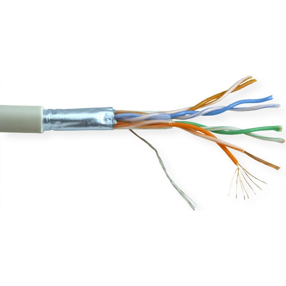 Фольгированная витая пара (англ. FTP - Foiled twisted pair) - присутствует один общий внешний экран в виде фольги. Экранирование обеспечивает лучшую защиту от электромагнитных наводок как внешних, так и внутренних и т. д. Экран по всей длине соединен с неизолированным дренажным проводом, который объединяет экран в случае разделения на секции при излишнем изгибе или растяжении кабеля. Спецификация: UTP/FTP/SFTP: FTP (общий экран — фольга). Internal/Ourdoor: для прокладки внутри помещений. Solid/Stranded: stranded (многожильный). AWG: 24. Материал проводника: CCA. Материал оболочки: PVC.