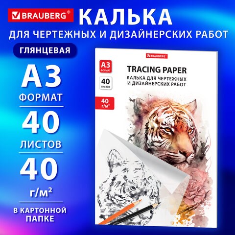 Калька для чертежных и дизайнерских работ папка, А3, 297х420 мм, 40 г/м2, 40 листов, BRAUBERG, 116374
