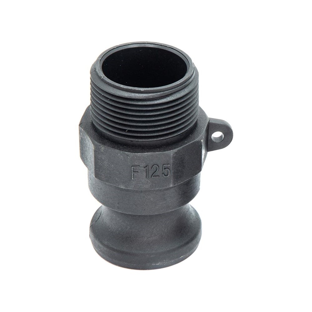 F: тип камлока - соединительный штуцер с наружней резьбой и ответной частью "папа" 125: условное обозначение диаметра камлока 1 1/4": внутренний диаметр трубы (условный проход трубы), обозначение размера резьбы в дюймах. Соответствует 32 мм. Вид резьбы: дюймовая трубная коническая R (BSPT) Материал корпуса: полипропилен, усиленный стекловолокном 25%. Устойчив к кислотам, щелочам, органическим соединениям, нефтепродуктам. Имеет превосходную механическую прочность, низкую температуру плавления и гладкую поверхность с высоким коэффициентом скольжения Номинальное рабочее давление: 9 бар Рабочая температура камлока: от -10°C до +65°C