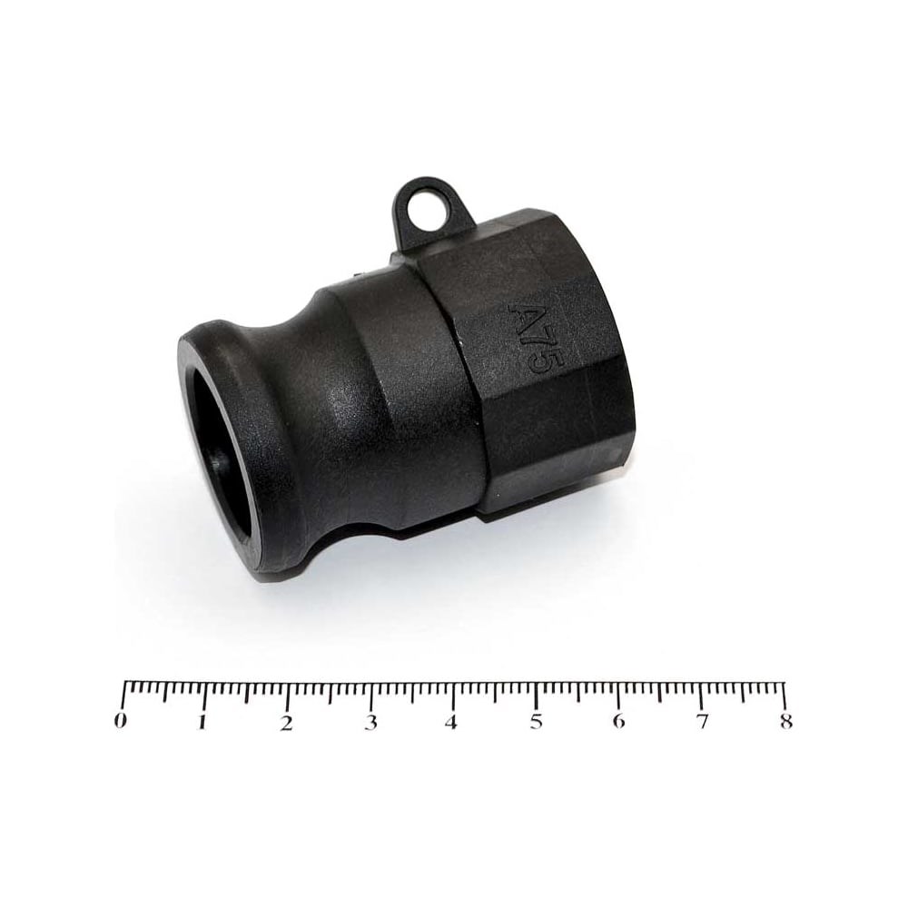 А: тип камлока - соединительный штуцер с внутренней резьбой и ответной частью "папа" 075: условное обозначение диаметра камлока 3/4": внутренний диаметр трубы (условный проход трубы), обозначение размера резьбы в дюймах. Соответствует 20 мм. Вид резьбы: дюймовая трубная цилиндрическая G (BSPP) Материал корпуса: полипропилен, усиленный стекловолокном 25%. Устойчив к кислотам, щелочам, органическим соединениям, нефтепродуктам. Имеет превосходную механическую прочность, низкую температуру плавления и гладкую поверхность с высоким коэффициентом скольжения Номинальное рабочее давление: 9 бар Рабочая температура камлока: от -10°C до +65°C