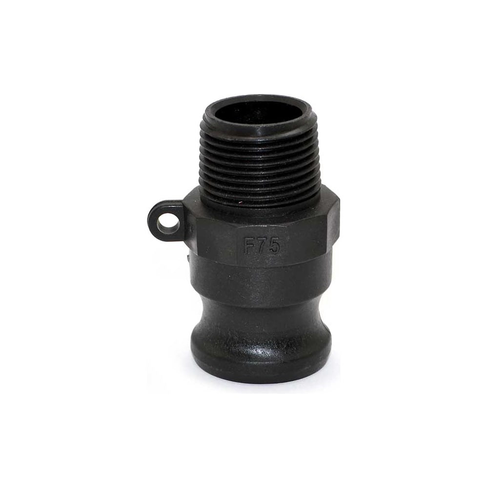 F: тип камлока - соединительный штуцер с наружней резьбой и ответной частью "папа" 075: условное обозначение диаметра камлока 3/4": внутренний диаметр трубы (условный проход трубы), обозначение размера резьбы в дюймах. Соответствует 20 мм. Вид резьбы: дюймовая трубная коническая R (BSPT) Материал корпуса: полипропилен, усиленный стекловолокном 25%. Устойчив к кислотам, щелочам, органическим соединениям, нефтепродуктам. Имеет превосходную механическую прочность, низкую температуру плавления и гладкую поверхность с высоким коэффициентом скольжения Номинальное рабочее давление: 9 бар Рабочая температура камлока: от -10°C до +65°C