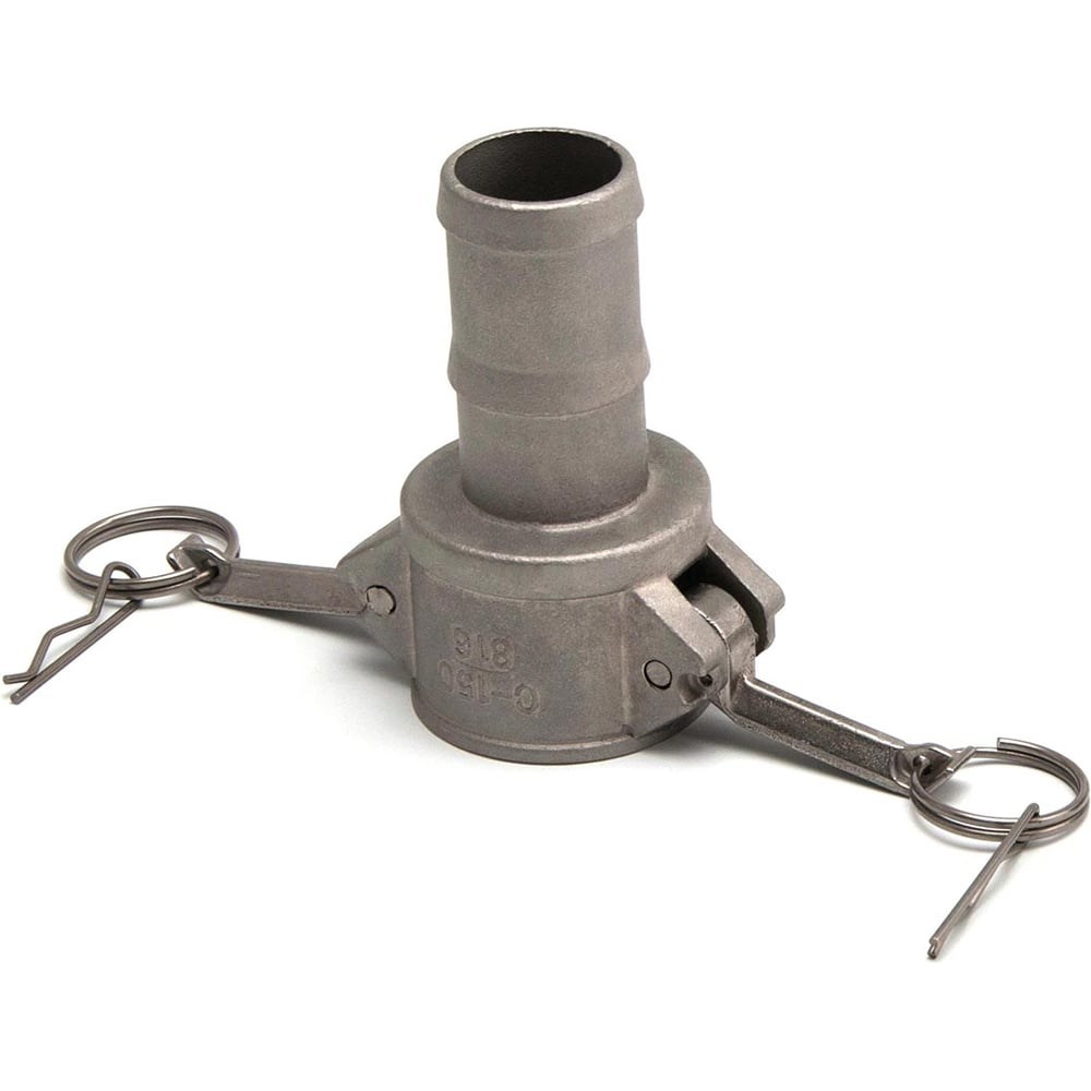 С: тип камлока - муфта со штуцером типа "ёлочка" и приёмной частью "мама" с фиксаторами кулачкового типа 150: условное обозначение диаметра камлока 1 1/2": внутренний диаметр трубы (условный проход трубы). Соответствует 38 мм. Материал уплотнения для стороны с приёмной частью "мама": кольцо прямоугольного сечения из силикона Материал корпуса: нержавеющая сталь AISI 316 - это сталь AISI 304, улучшенная путём добавления молибдена и никеля. Благодаря молибдену данная сталь немагнитна, особенно устойчива к коррозии, высоким температурам и агрессивным средам (серная, фосфорная, борная, муравьиная, уксусная, щавелевая, молочная и прочие кислоты) Материал кулачков: нержавеющая сталь Номинальное рабочее давление: 20 бар Рабочая температура уплотнения: от -60°C до +200°C Рабочая температура камлока: от -65°C до +260°C