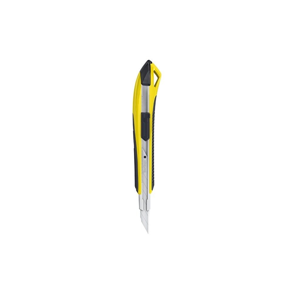Канцелярский нож выполнен из высококачественного ABS пластика с применением технологии двойного литья (прорезиненные вставки). Имеет металлические направляющие. Модель имеет автоматическую фиксацию лезвия AUTO-LOCK и дополнительно оснащена замком блокировки. Комплектуется износостойким лезвием из стали SK5 с углом 30°. Нож поставляется в индивидуальной упаковке - блистер. На оборотной стороне блистера есть перфорация для более удобного извлечения инструмента из упаковки.