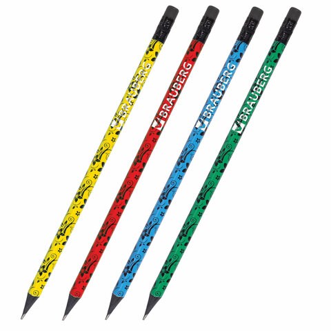 Карандаш чернографитный BRAUBERG, 1 шт., "Fuete", НВ, c ластиком, черное дерево, корпус ассорти, 180634