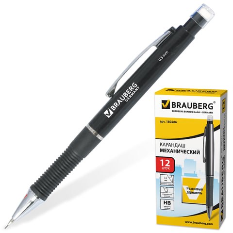 Карандаш механический 0,5 мм, BRAUBERG "Modern", ластик, резиновый грип, корпус черный, 180286