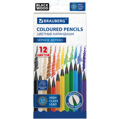 Карандаши цветные BRAUBERG, 12 цветов, шестигранные, грифель 3,3 мм, черное дерево, 181856
