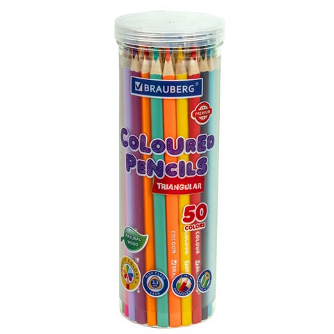 Карандаши цветные BRAUBERG PREMIUM 50 цветов в тубе, трехгранные, грифель 3,3 мм, натуральное дерево, 181935