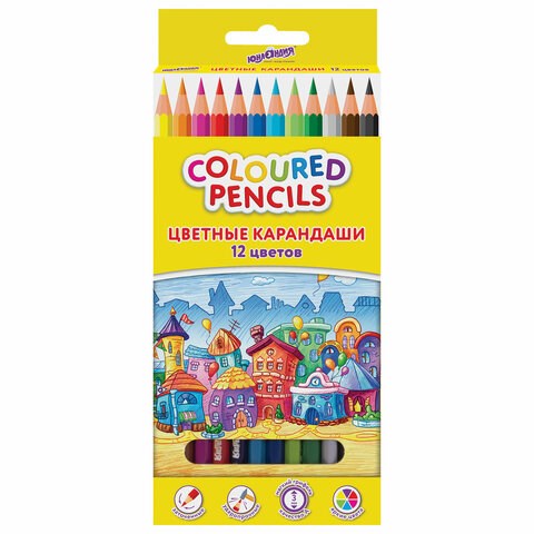 Карандаши цветные ЮНЛАНДИЯ "ДОМИКИ", 12 цветов, шестигранные, грифель 3 мм, 181836