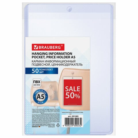 Карман информационный подвесной, ценникодержатель А5, КОМПЛЕКТ 50 шт., ПВХ, BRAUBERG, 291285
