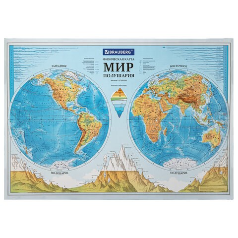Карта мира физическая "Полушария" 101х69 см, 1:37М, интерактивная, европодвес, BRAUBERG, 112375