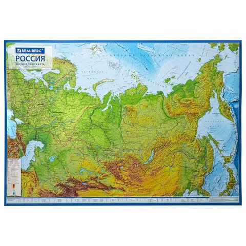 Карта России физическая 101х70 см, 1:8,5М, с ламинацией, интерактивная, европодвес, BRAUBERG, 112392