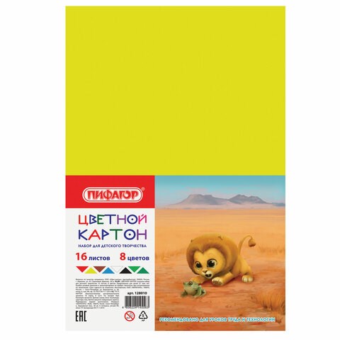 Картон цветной А4 немелованный (матовый), 16 листов 8 цветов, ПИФАГОР, 200х283 мм, 128010