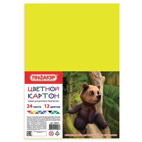 Картон цветной А4 немелованный (матовый), 24 листа 12 цветов, ПИФАГОР, 200х283 мм, 128012
