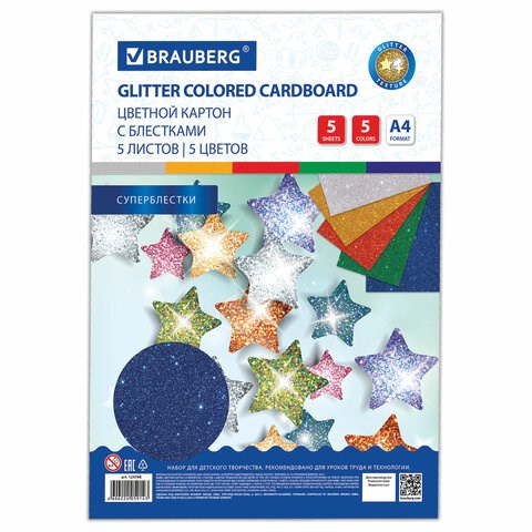 Цветной картон со сплошными блестками обладает плотностью 280 г/м2. Может использоваться, начиная с трехлетнего возраста. Картон легко режется ножницами, сгибается и клеится. Внутренний блок состоит из 5 листов формата А4 (210х290 мм) и 5 цветов.