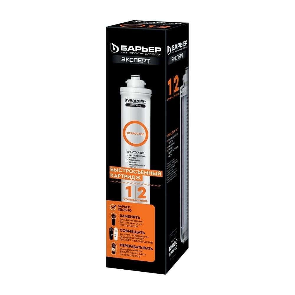 БАРЬЕР ЭКСПЕРТ Ферростоп - содержит специальный многослойный материал, эффективно удаляющий не только железистые взвеси, но и растворенное железо при его повышенной концентрации до 5 ПДК. Картридж задерживает примеси железа посредством каталитического окисления и последующей механической очистки.Финишный слой препятствует сбросу отфильтрованного железа в чистую воду. Используется как 1-я ступень в фильтре ЭКСПЕРТ Комплект/ЭКСПЕРТ СЛИМ Комплекс. Технология ONE TOUCH - замена картриджа одним движением, без специальных инструментов. Технология Smart lock обеспечивает защиту от протечек. Совместим со всеми проточными фильтрами БАРЬЕР Эксперт, БАРЬЕР Актив, БАРЬЕР СЛИМ Ресурс — 10 000 л. Производительность 2 л/мин. Рабочее давление — 0,5–7,0 атм. Выбирайте фильтр с помощью Карты Воды: https://www.vseinstrumenti.ru/promo-page/barier-karta-vody-841/