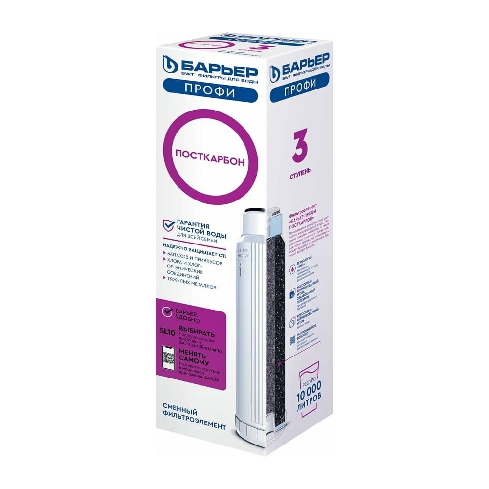 Картридж для фильтра под мойку БАРЬЕР ПРОФИ ПостКарбон, защищает от хлора Р151Р00 применяется в фильтрах Барьер для очистки холодной воды. Обеспечивает эффективную очистку воды от ионов тяжелых и токсичных металлов, растворенного железа. Содержит высококачественный гранулированный активированный уголь, обработанный серебром, который устраняет неприятные запахи и улучшает вкус воды. Стандарт картриджа - Slim Line 10".