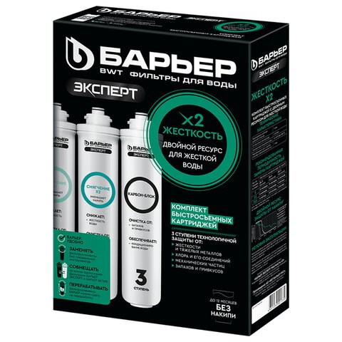 Сменные быстросъемные картриджи для проточного фильтра БАРЬЕР ЭКСПЕРТ. Комплект сменных картриджей БАРЬЕР ЭКСПЕРТ Жесткость х2 для жесткой городской воды обладает повышенным ресурсом против накипи и позволяет забыть об осадке в чайнике на целый год.