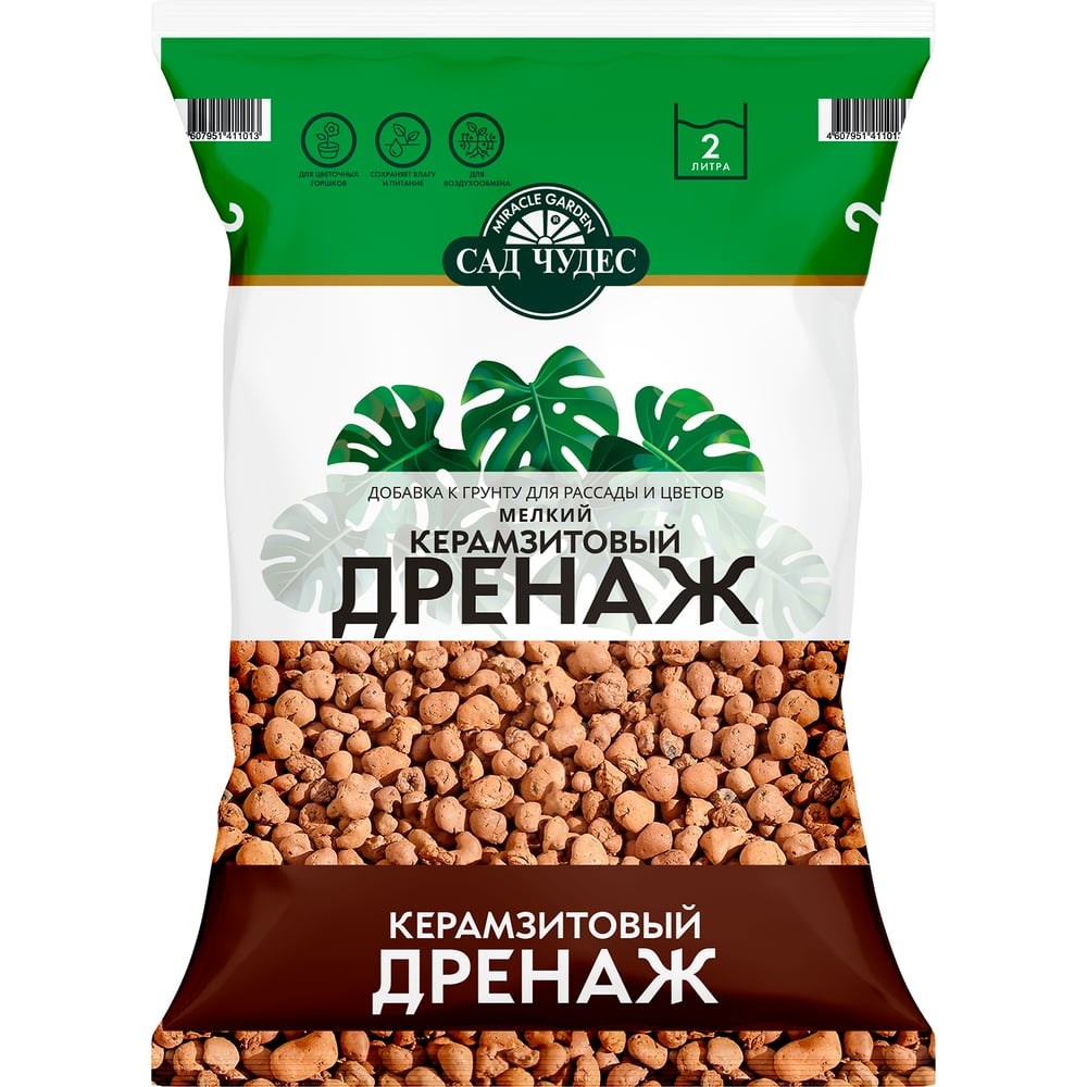 Дренаж керамзитовый «Сад Чудес» мелкий - размер шариков 4-10 мм - предназначен для выращивания комнатных растений, рассады овощных и цветочно-декоративных культур в качестве добавки к грунту. Дренаж для цветов изготовлен из экологически чистой красной глины. Керамзит используется: Для удержания влаги в почве - рассыпать гравий на поверхности, толщиной 2-3 см Для улучшения водо- воздухообмена почвы - поместить дренаж на дно горшка толщиной 2-4 см, сверху насыпать питательный грунт, или смешать керамзит с грунтом (до 25% гравия)