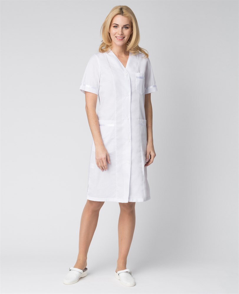 Халат женский «Светлана» изготовлен в соответствии с ГОСТ. Рабочая одежда удобного кроя из высококачественных материалов обеспечивает комфортную работу на производствах, в медицинских и образовательных учреждениях. Плотная ткань с водоотталкивающей пропиткой надежно защищает от загрязнений разного типа, отличается износостойкостью и длительным периодом эксплуатации. Халат белый рабочий дополняется вшивным поясом на кнопках, который подчеркивает и регулирует линию талии. Женский рабочий халат с коротким рукавом и длиной до колена отлично сидит по фигуре, не стесняет движения, выглядит модно и привлекательно. Халат застегивается на петли и пуговицы. В объемных боковых и нагрудном карманах удобно хранить записи и мелочи.