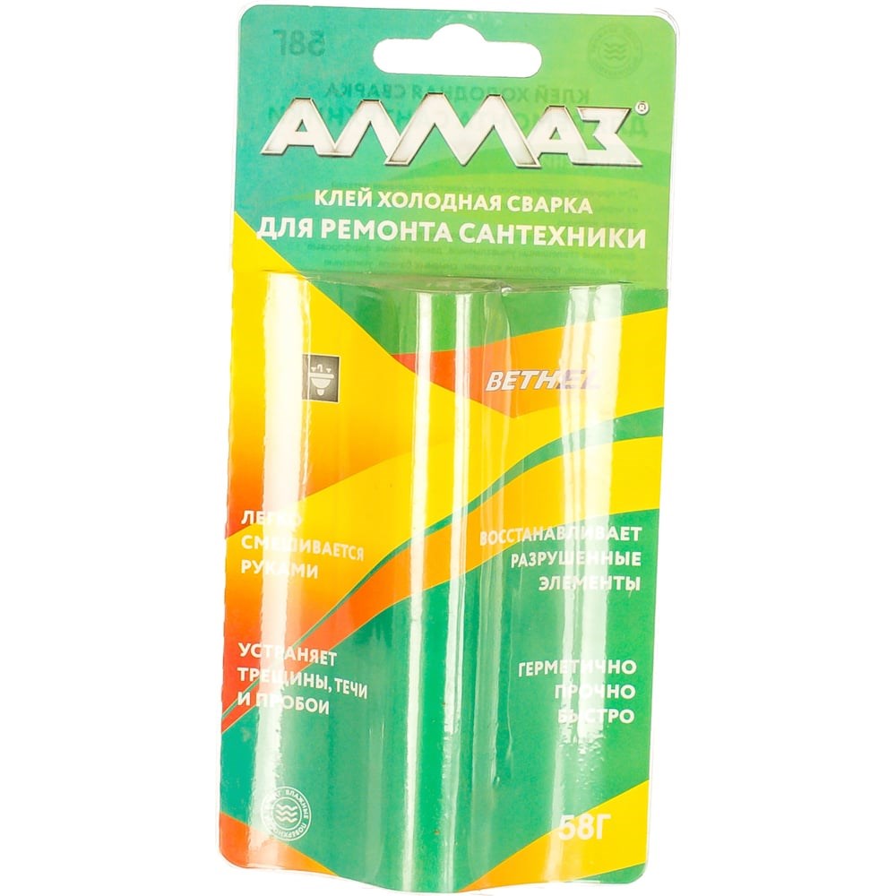 Клей для ремонта сантехникиВосстанавливает расколовшиеся керамические раковины, фаянсовые столешницы умывальников, треснувшие крышки смывных бачков, надколотые корпуса смесителей и другие элементы сантехники. Устраняет течи фитинговых соединений, свищи в трубах (точечные пробои), продольные трещины в трубах, течи в ванных и душевых поддонах. Благодаря белому цвету делает места соединения менее заметными. Подходит для ремонта фарфоровых декоративных изделий. В состав Клея холодная сварка «Алмаз» входит 2 компонента отвердитель и эпоксидная смола. К ним добавляются два вида наполнителя – минеральный и (или) металлический.