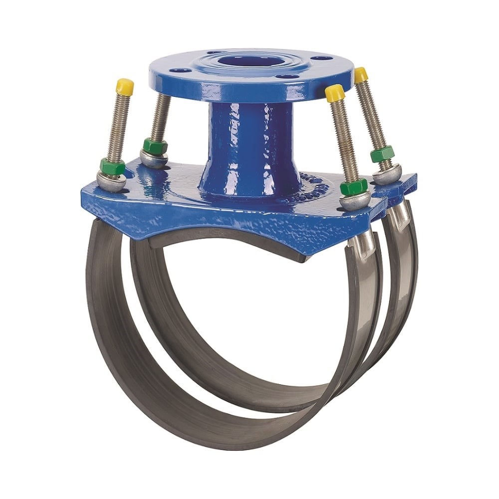 Отводы хомутовые фланцевые предназначены для быстрого создания ответвления от магистрального трубопровода для монтажа трубопроводной арматуры с фланцевым или резьбовым соединением. Врезку возможно выполнить без отключения давления рабочей среды. Отвод хомутовый (хомутовый отвод фланцевый, седёлка фланцевая, хомут врезной фланцевый, седло врезное фланцевое) состоит из седла, уплотнения, фиксирующего хомута, резиновой обкладки, опорных втулок и гаек Седло покрыто эпоксидно-порошковой эмалью толщиной 250 мкр. Отвод на магистральную трубу с фланцем DN 50 имеет один фиксирующий хомут, с фланцами DN 80 и DN100 - два хомута. На концах нержавеющего хомута приварены шпильки для его натяжения вокруг трубы путем протягивания гаек. Отводы хомутовые не являются фитингами, несущими конечную нагрузку. Отводы хомутовые (хомутовый отвод фланцевый, седёлка фланцевая, хомут врезной фланцевый, седло врезное фланцевое) не могут воспринимать неуравновешенную нагрузку от массы конца ответвительной трубы. Трубы должны быть жестко зафиксирована на опорах. Монтаж производится в пространственном положении удобном для врезки.