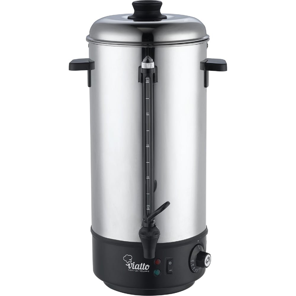 Кипятильник VIATTO / MK-WB10 настольный, автономный (наливной), емкость резервуара 10 л, закрытый ТЭН, терморегулятор (30-100С), мерное стекло, разливной кран, материал корпуса - нерж.сталь/пластмасса, 220В, 1,8кВтРекомендуется к применению в кафе, столовых, фаст-фуд заведениях и на других предприятиях общественного питания малого и среднего форматов.
