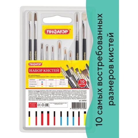 Кисти ПИФАГОР, набор 10 шт. (ПОНИ: плоская № 4, круглые № 1, 2, 3, 5; СИНТЕТИКА: круглые № 1, 3, 5; ЩЕТИНА: плоские № 4, 8), блистер, 200505