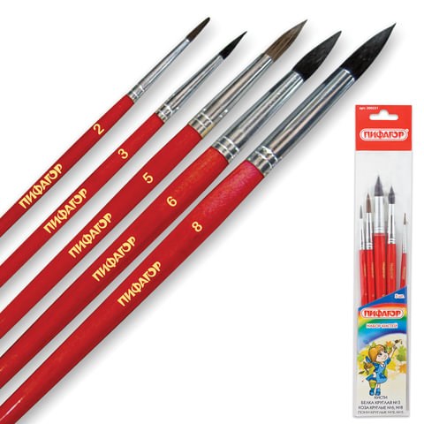 Кисти ПИФАГОР, набор 5 шт. (БЕЛКА: круглая № 3; КОЗА: круглые № 6, 8; ПОНИ: круглые № 2, 5), пакет с европодвесом, 200231