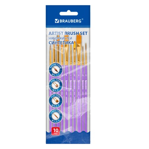 Кисти синтетика BRAUBERG, НАБОР 10 шт., фиолетовые (Круглые; Овальные; Плоские; Лайнеры), 201029