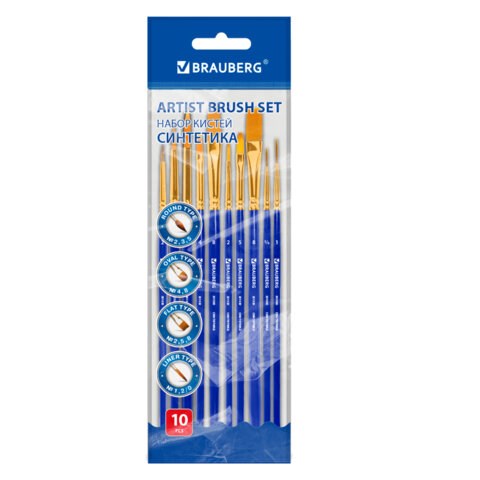 Кисти синтетика BRAUBERG, НАБОР 10 шт., синие (Круглые; Овальные; Плоские; Лайнеры), 201030