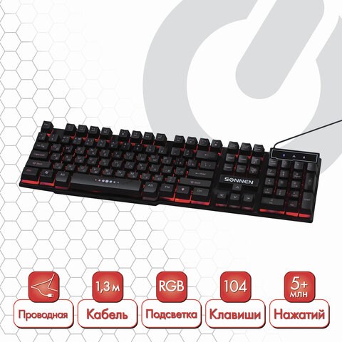 Клавиатура проводная SONNEN KB-7010, USB, 104 клавиши, LED-подсветка, черная, 512653