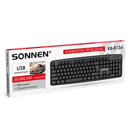 Клавиатура SONNEN KB-8136 имеет классическую раскладку – 104 клавиши. Корпус классической формы выполнен из ударопрочного ABS-пластика черного цвета. Матовое покрытие клавиатуры устойчиво к возникновению мелких царапин и не оставляет следов от прикосновений пальцев. Подключение через USB-разъем. Длина кабеля – 1,2 м.