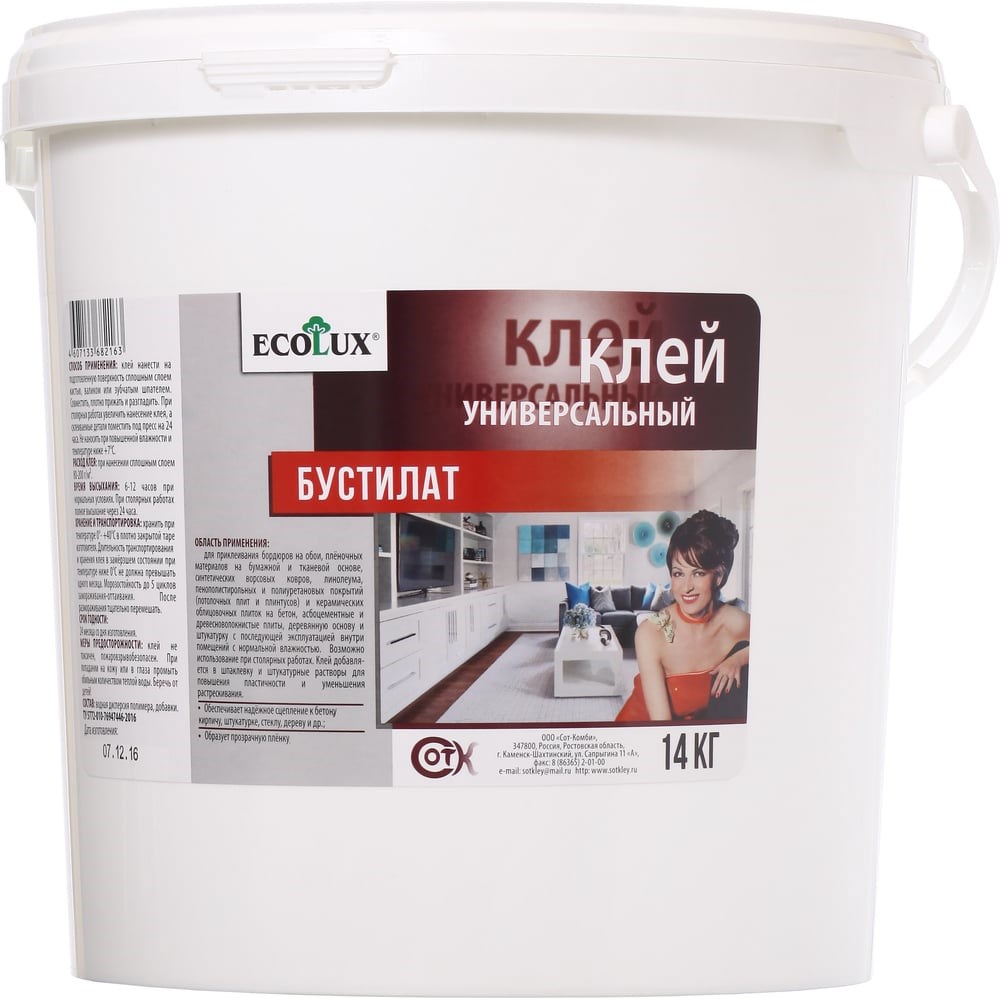 Клей бустилат ECOLUX 14 кг 4607133682163 предназначен для приклеивания бордюров на обои, плёночных материалов на бумажной и тканевой основе, синтетических ворсовых ковров, линолеума, пенополистирольных и полиуретановых покрытий и керамических облицовочных плиток на бетон, асбоцементные и древесноволокнистые плиты, деревянную основу и штукатурку с последующей эксплуатацией внутри помещений с нормальной влажностью. Возможно использование при столярных работах. Клей добавляется в шпатлевку и штукатурные растворы для повышения пластичности и уменьшения растрескивания.