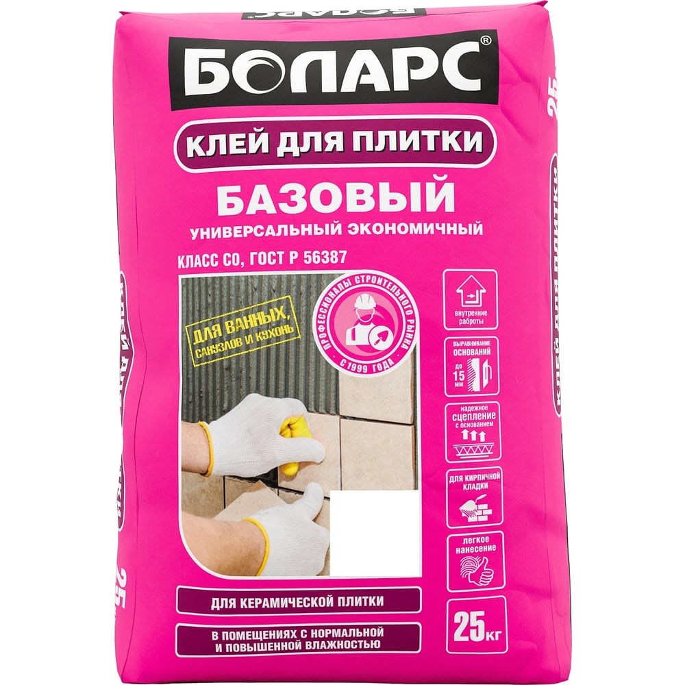 Клей для плитки БОЛАРС Базовый 25 кг, класс C0 00000003737 - универсальный экономичный клей для крепления всех видов керамической плитки размером до 300х300 мм на горизонтальные и вертикальные основания в помещениях с нормальной и повышенной влажностью. Может быть использован в качестве кладочного раствора для возведения кладок из кирпича и цементно-песчаных блоков, а также для локального выравнивания базовых поверхностей слоем до 15 мм. Состав наносится ручным способом. Применяется по минеральным недеформирующимся основаниям: бетонным, газобетонным, кирпичным, цементным стяжкам, штукатуркам.