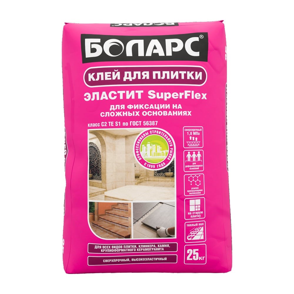 Клей для плитки БОЛАРС ЭЛАСТИТ SUPER FLEX 25 кг, класс C2TES1 00000038369 - высокоэластичный, сверхпрочный, стойкий к сползанию клей для надежного крепления всех видов керамической плитки, клинкера, а также керамогранита, мрамора, натурального и искусственного камня. Обеспечивает максимальную прочность сцепления с основаниями, в том числе, деформирующимися, а также с основаниями, подверженными вибрациям. Применяется по основаниям, подверженным температурным колебаниям (террасы, балконы, полы с подогревом) и повышенным эксплуатационным нагрузкам (торговые центры, промышленные цеха, склады). Надежен при эксплуатации в условиях постоянного и периодического контакта с водой: для облицовки чаш бассейнов, фонтанов, ванных комнат, душевых, бань, саун, подвалов, фасадов, цоколя. Подходит для приклеивания плитки на старую плитку. Рекомендован для облицовки лестниц.  Используют по основаниям: бетон (пено-, газо-, шлакобетон, газосиликат), цементные основания (цементная и цементно-известковая штукатурка и шпатлевка, стяжка, наливной пол), гипсовые основания (штукатурка, ПГП, наливной пол), кирпич, ГКЛ, ГВЛ, ЦСП, OSB. Изготовлен на основе высококачественного цемента, фракционированного песка, высокоэффективных модифицирующих добавок и полимеров.