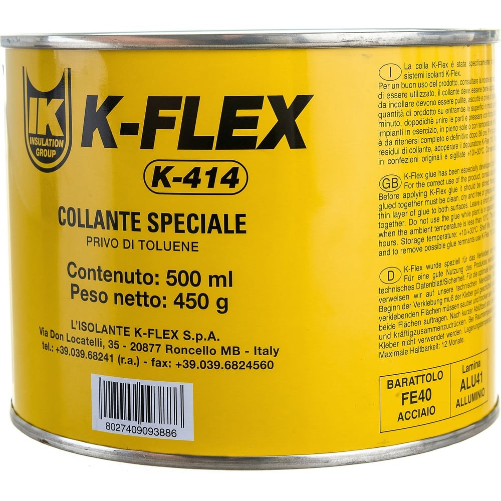 Клей для теплоизоляции K-FLEX 0.5 л K 414 850CL020002 представляет собой однокомпонентный контактный клей на основе полихлоропренового каучука и предназначен для склейки изделий K–FLEX и покрытий AL CLAD, IC CLAD SR и IC CLAD BK. Внешний вид - жидкость от жёлтого до красного цвета Вязкость при 20 °С - 600±50 МПа Плотность - 30,85 ± 0,05 г /см Время высыхания - 5-10 мин. Открытое время - 10-20 мин. Диапазон рабочих температур: от -40 до +110°С Температура клея при нанесении: от +10 до +30°С