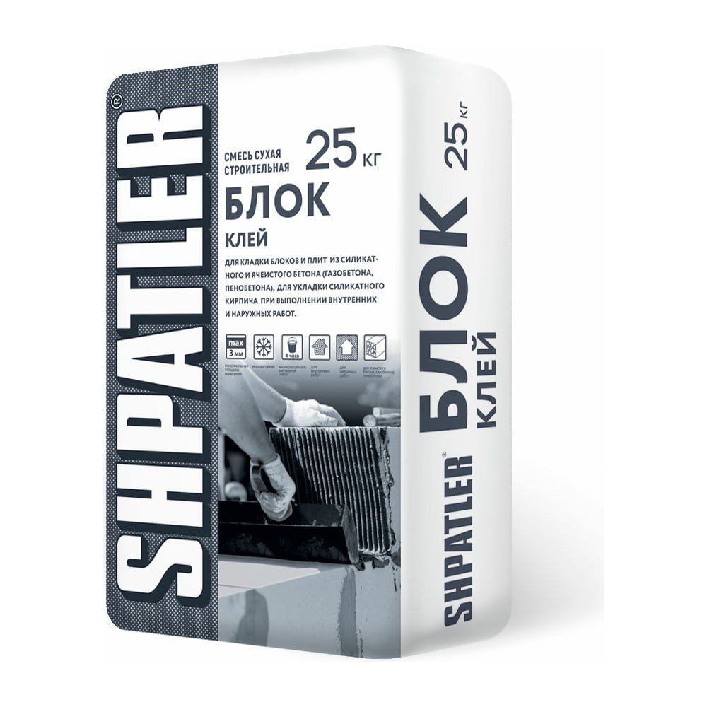 Клей для укладки блоков Шпатлер Блок 25 кг Ш00026 - это сухая строительная смесь на основе цемента, фракционированного заполнителя и функциональных добавок. При смешивании с водой образует удобную в работе пластичную растворную смесь, которая обладает высокой прочностью сцепления с основанием. Клей является водостойким и морозостойким. Состав предназначен для кладки плит и блоков силикатного и из ячеистого бетона (газобетона, пенобетона), для укладки силикатного кирпича при выполнении внутренних и наружных работ.