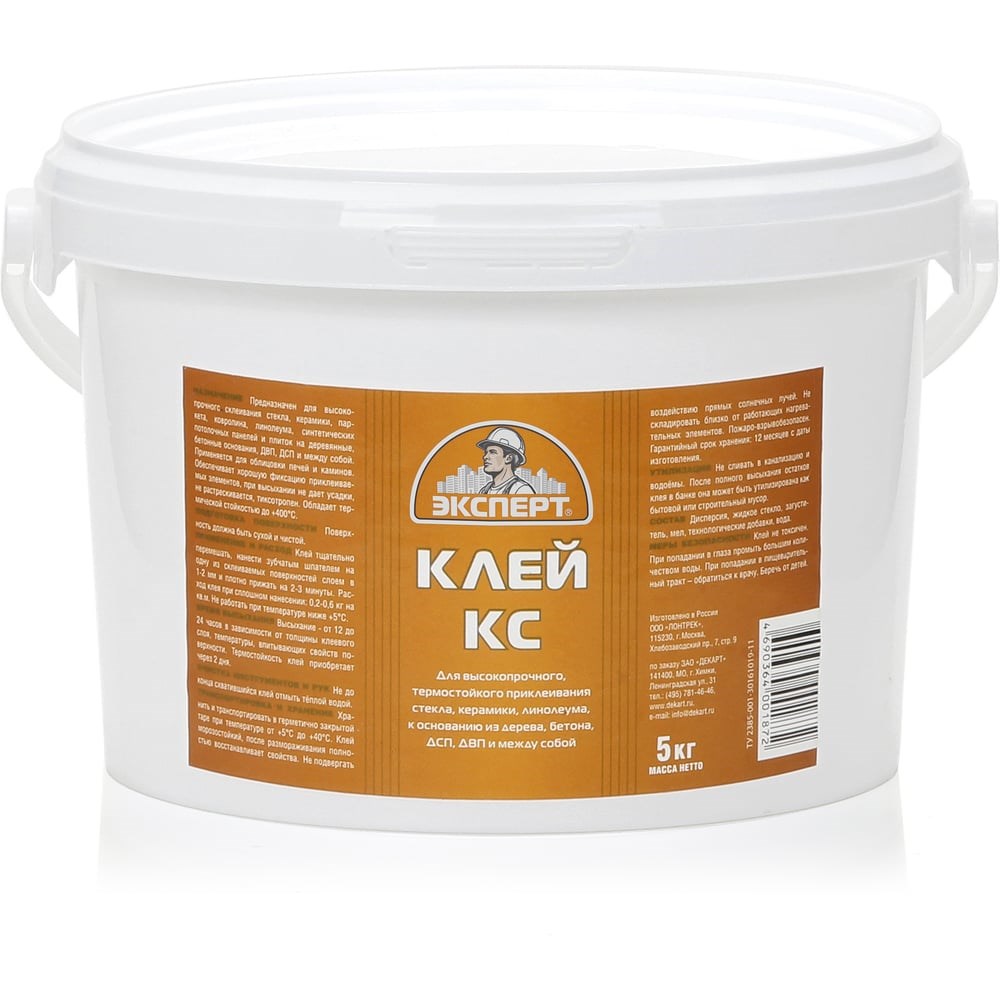 Клей Эксперт КС 5 кг 17713 - высокопрочный термостойкий клей (до + 400°С) применяется для приклеивания стекла, керамики, линолеума, к основанию из дерева, бетона, ДСП, ДВП и между собой. Идеально подходит для работ по облицовке печей и каминов.
