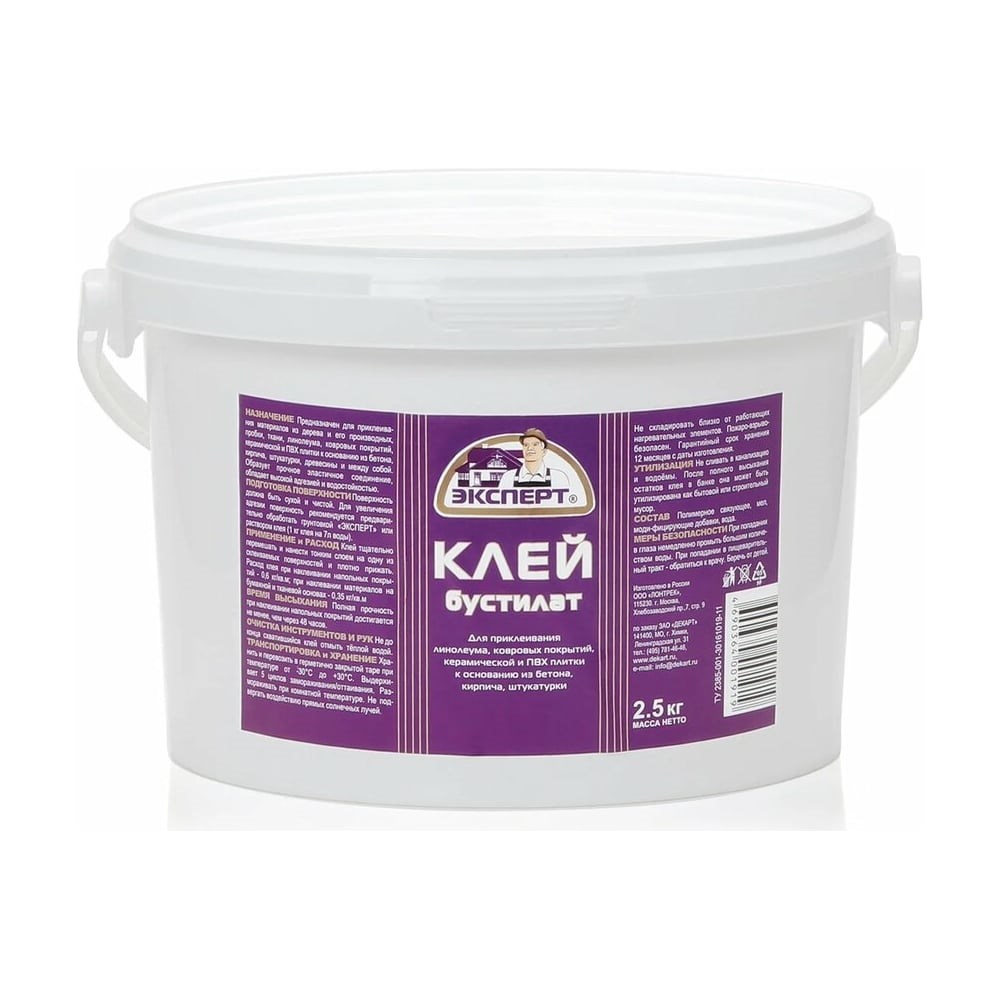 Клей Бустилат ЭКСПЕРТ 2.5 кг 17711 применяется для приклеивания линолеума, ковровых покрытий, керамической плитки и ПВХ плитки к основанию из бетона, кирпича, штукатурки, а также склеивания различных материалов между собой.